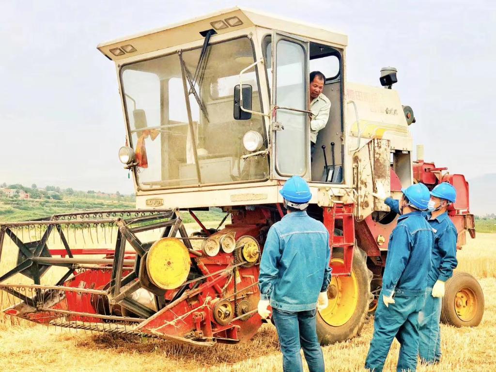 國家電網(wǎng)西安供電公司長安分公司工作人員在麥田叮囑收割機(jī)手注意夏收安全。(受訪者供圖)