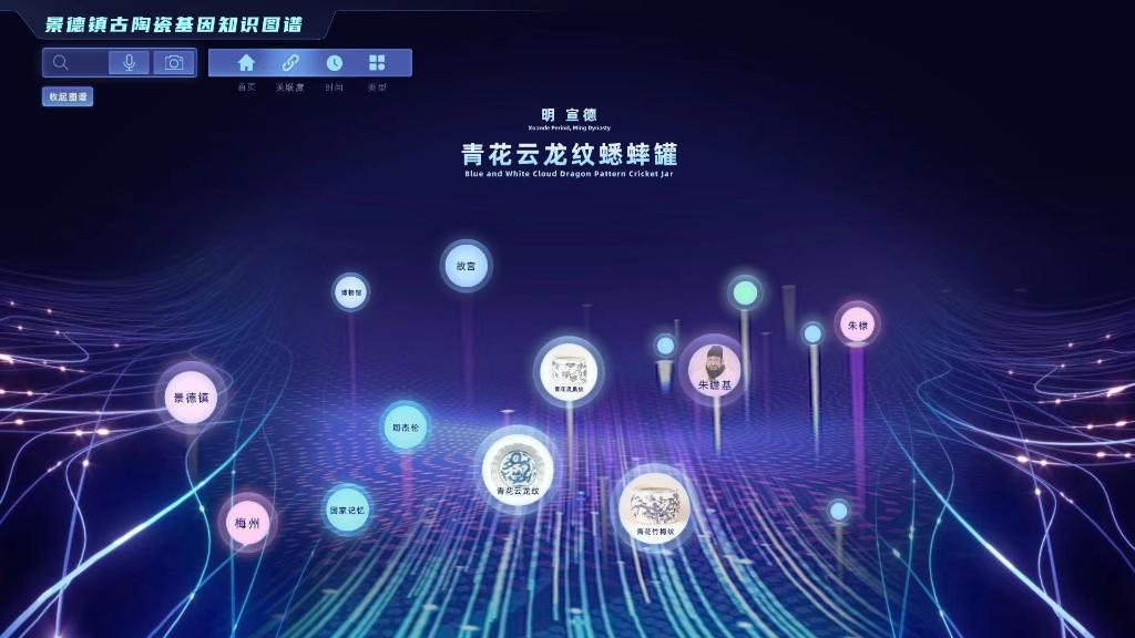 結合數字化等新技術,還可還原歷史生活場景,勾連當下人文風物。同步繪制的景德鎮古陶瓷基因知識圖譜,把碎片化的信息整合成全景式的系統化知識。如一件明永樂時期的青花阿拉伯紋無擋尊,既可還原明代鄭和下西洋時期東西方文化在器型和紋飾方面的交融,又可關聯同款傳世品的館藏地故宮博物院、北京冬奧會青花瓷服飾等信息。