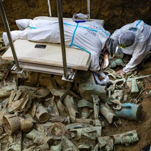 在三星堆遺址8號“祭祀坑”,8號“祭祀坑”發掘負責人、北京大學考古文博學院副教授趙昊(左)與考古工作者任俊鋒一起清理銅神壇(6月1日攝)。新華社記者 沈伯韓 攝