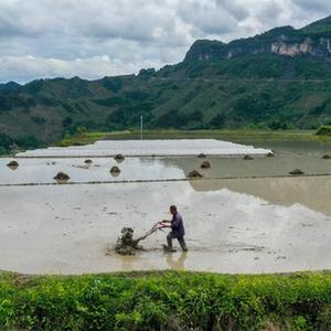 4月25日,重慶市酉陽縣花田鄉,稻農在水田里使用小農機進行勞作(無人機照片)。新華社記者 唐奕 攝