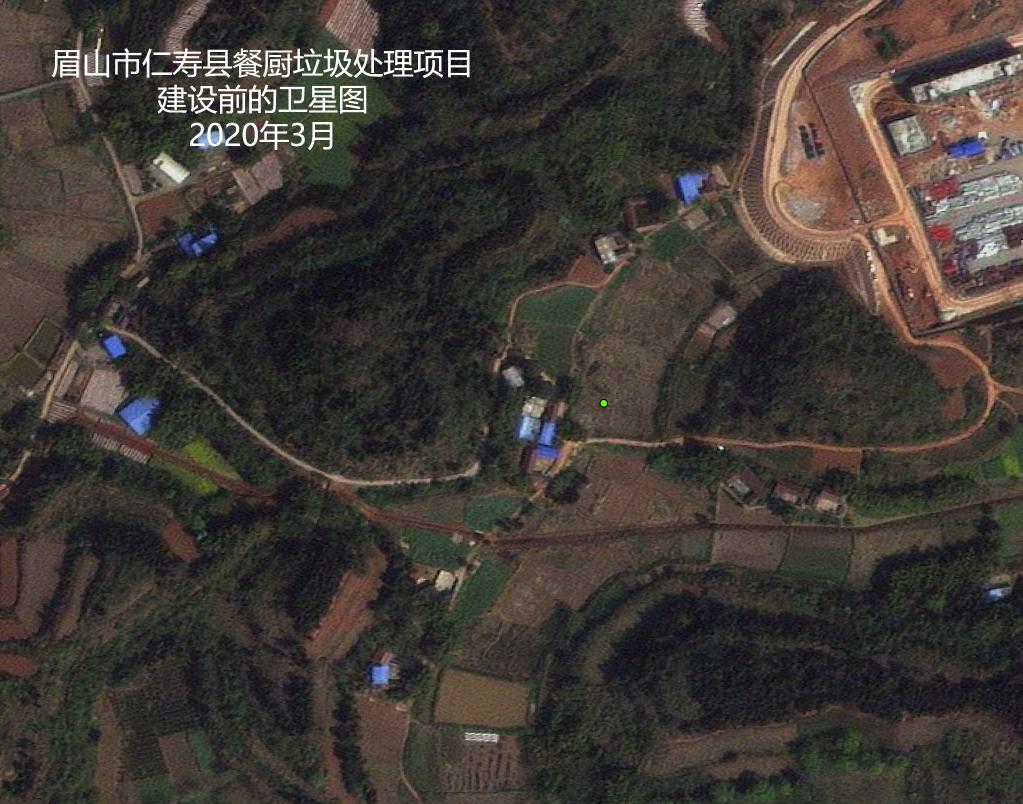 眉山市在仁壽縣建設餐廚垃圾無害化處置項目,著力打造餐廚垃圾收集、轉運、處置體系。上圖為該項目建設前的衛星圖,下圖為項目建設完成后的衛星圖。