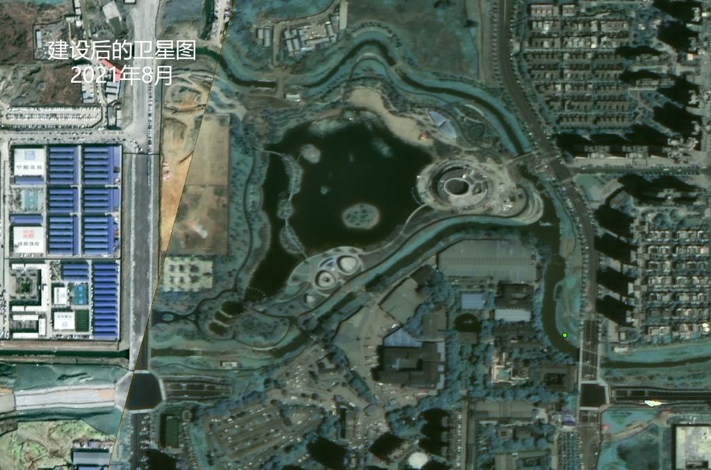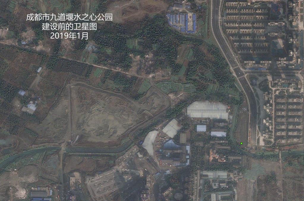 作為沱江流域成都段治理模式的范例,九道堰河流域被確定為生態文明建設主題公園。上圖為公園建設之前的衛星圖和實拍圖,建設前,這里雜草叢生,河道淤積,有的河段成為臭水溝。下圖為公園建設后的衛星圖和實拍圖。