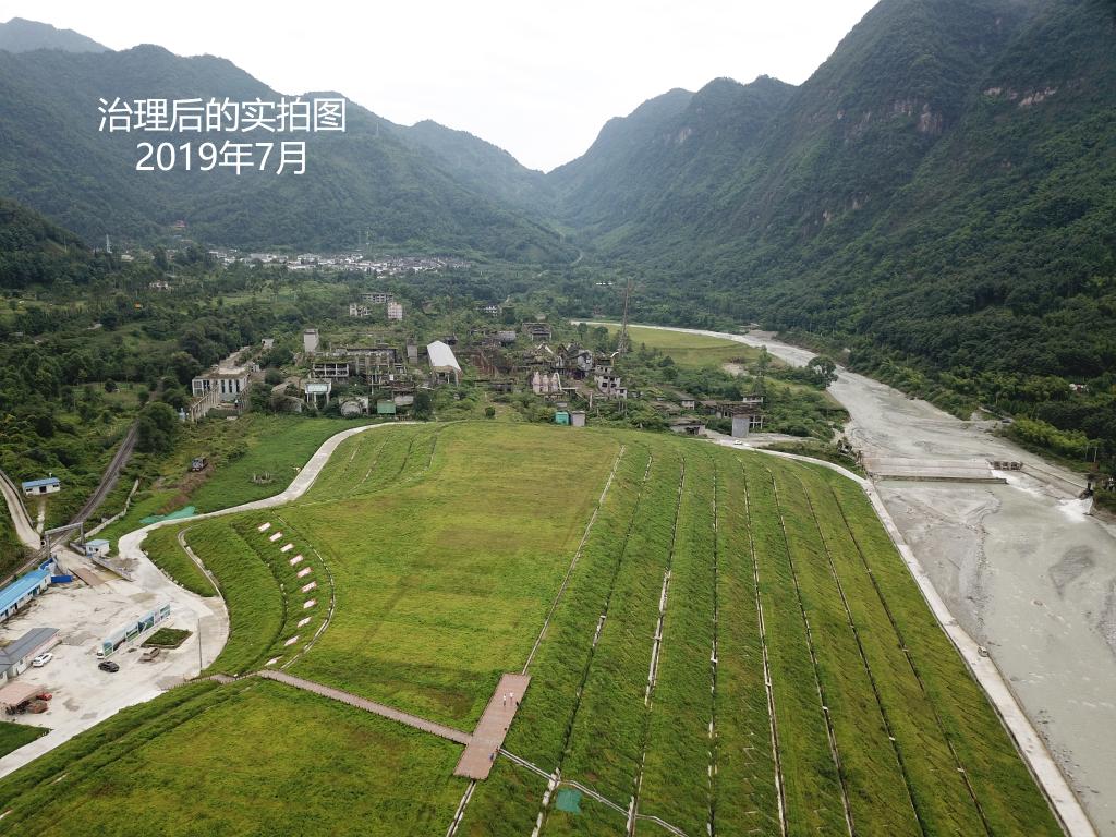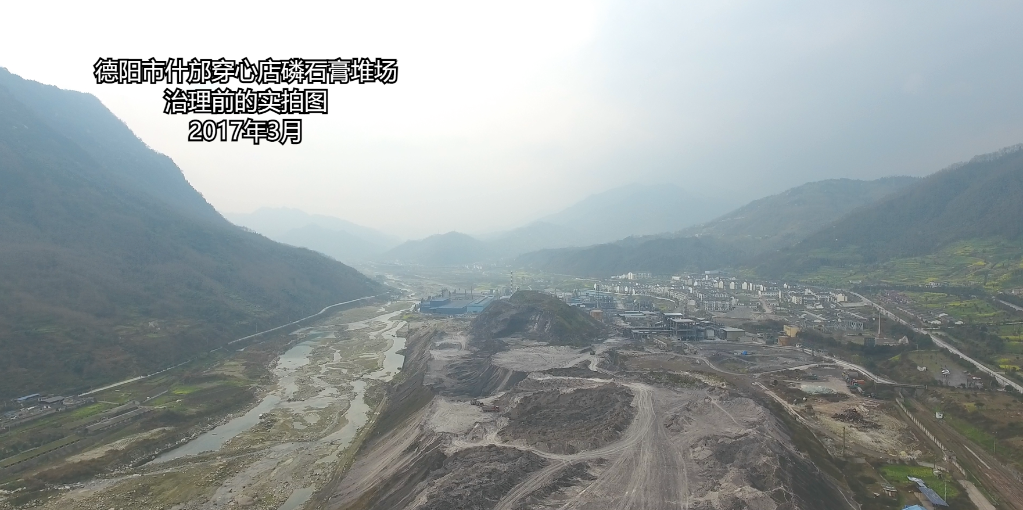 德陽什邡市穿心店磷石膏堆場位于沱江上游支流石亭江岸。由于各方面原因,磷石膏堆場時常出現滲漏、滑坡等情況,導致周邊水質、土壤及石亭江總磷超標,影響沱江下游水質。上圖為位于磷石膏堆場治理前的衛星圖和實拍圖。下圖為同一點位,磷石膏堆場治理后的衛星圖和實拍圖。