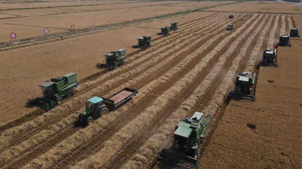臨河區(qū)新華鎮(zhèn)十萬(wàn)畝高產(chǎn)高效糧食生產(chǎn)示范園區(qū)開(kāi)展麥?zhǔn)展ぷ鳌P氯A社記者 李云平攝