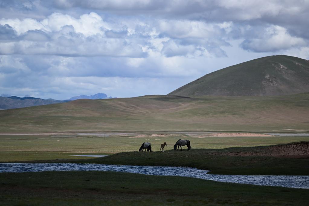 參賽馬匹在草場上吃草。新華社記者 張龍 攝
