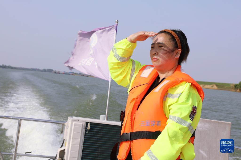 護魚員朱麗君在湖南省益陽市資江黃湖村河段巡護(2022年7月14日攝)。新華社發(盛擁軍攝)