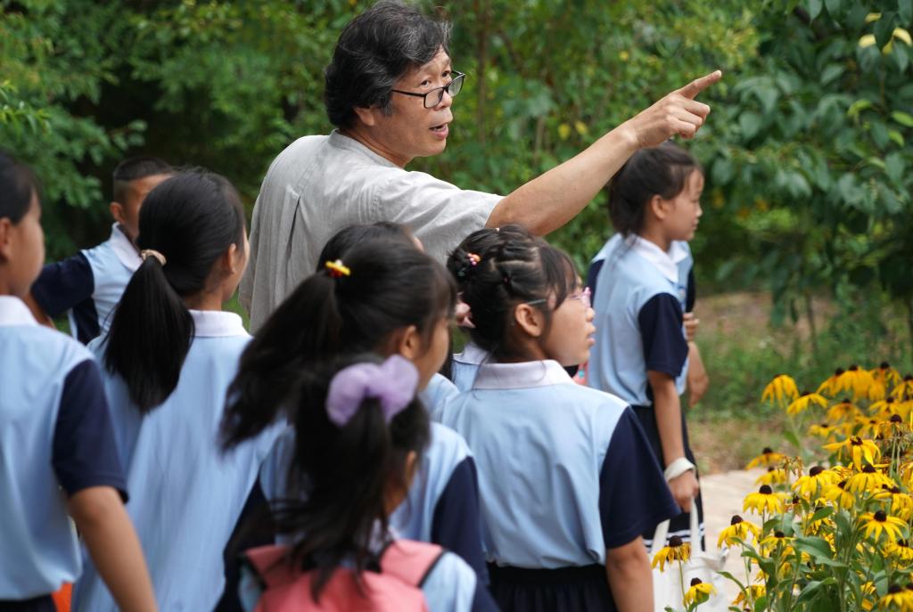 7月12日,在“洛陽三彩陶藝村”,郭愛和帶領羅嶺鄉中心小學的學生參觀。新華社記者 李安 攝