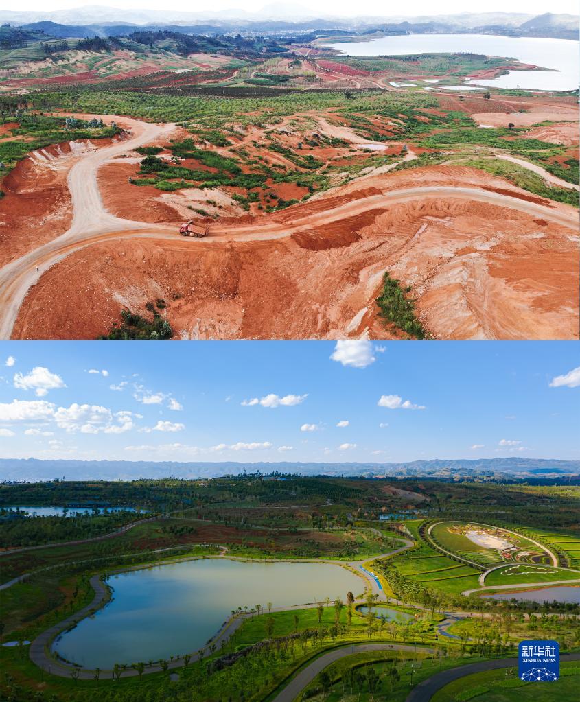 拼版照片:上圖是云南省彌勒市太平湖森林小鎮施工前景象(資料照片);下圖是云南省彌勒市太平湖森林小鎮(無人機照片,2018年11月10日攝,李昱廷攝)。 新華社發
