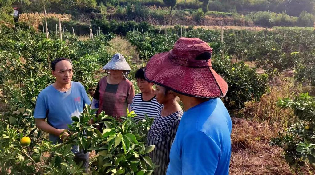 江一民在向村民講解果樹抗旱知識。(樂至縣委宣傳部供圖)