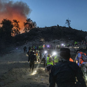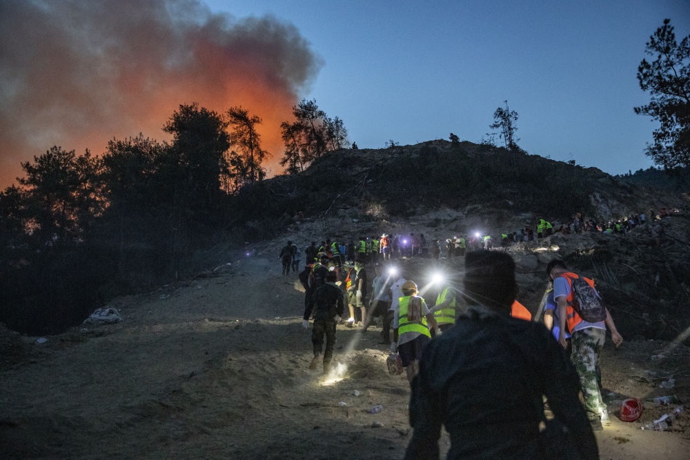 8月25日晚,在山頂隔離帶,救援人員和志愿者嚴陣以待。新華社記者 王全超 攝