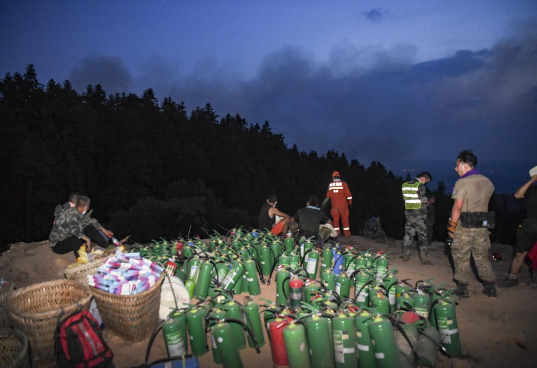當我們來到距離正在開辟的隔離帶最近的物資轉運點時,一片繁忙景象映入眼簾:源源不斷地運送救援物資和人員的摩托車抵達,卸下物資或人員,又迅速掉頭返回;負責后勤的志愿者正在準備飯菜、水果、飲料、毛巾,以及防暑降溫的物資;一些年輕的志愿者正在整理、裝運滅火器;武警官兵正在距離物資轉運點幾十米的地方集結,準備上山……