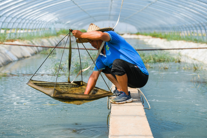 8月25日,在地處黃河岸邊的內(nèi)蒙古烏海市海南區(qū)巴音陶亥鎮(zhèn)的鹽堿水對蝦養(yǎng)殖園區(qū),工作人員在查看對蝦生長情況。新華社記者 劉磊 攝