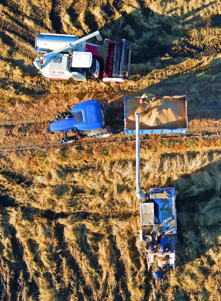 10月18日,在遼寧沈陽市沈北新區(qū)興隆臺(tái)鎮(zhèn)青年農(nóng)場(chǎng),農(nóng)民把機(jī)械化收割下來的水稻裝車(無人機(jī)照片)。 新華社記者 楊青 攝