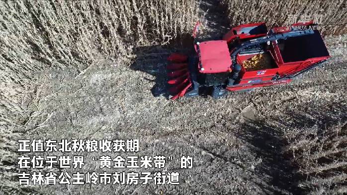 正值東北秋糧收獲期。在位于世界“黃金玉米帶”的吉林省公主嶺市劉房子街道,一臺無人駕駛的玉米收割機正在地里自動行走收獲玉米。