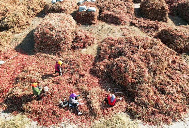工人在白腦包鎮(zhèn)辣椒產(chǎn)業(yè)示范園初選辣椒。(新華社記者李云平 攝)