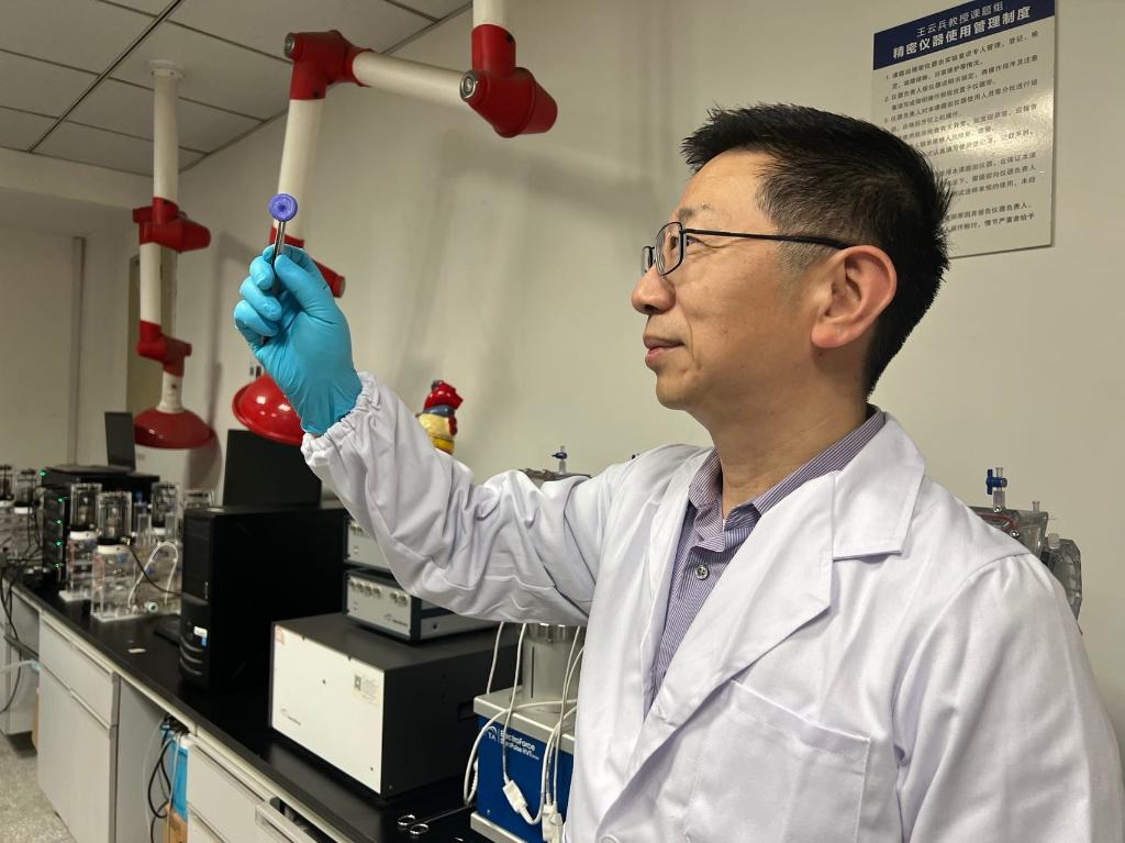 四川大學國家生物醫(yī)學材料工程技術(shù)研究中心主任王云兵展示全降解封堵器。新華社記者吳曉穎攝