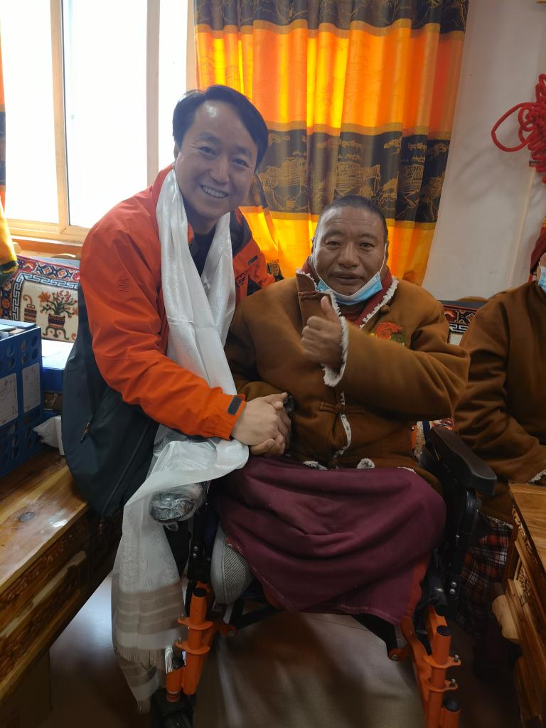即使是冬天,陽光好的時候,53歲的藏族群眾土扎也照常會操作著電動輪椅到敬老院的院壩里曬太陽。由于他的雙腿早年因病萎縮無法行走,來到敬老院后,輪椅成了他的另一雙腿,可以讓他自由地從房間到院壩、食堂等地。