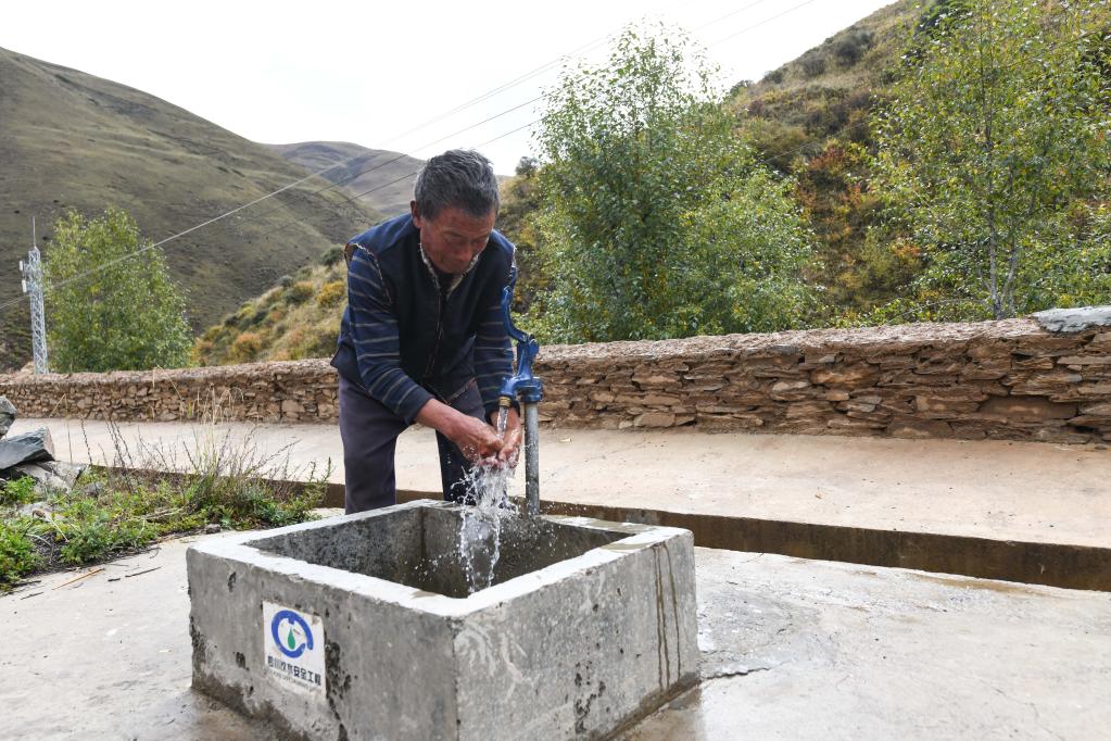 在四川省阿壩藏族羌族自治州壤塘縣茸木達鄉巴爾依村,鐘偉打開院子里的自來水龍頭洗手(2022年10月16日攝)。新華社記者王曦 攝