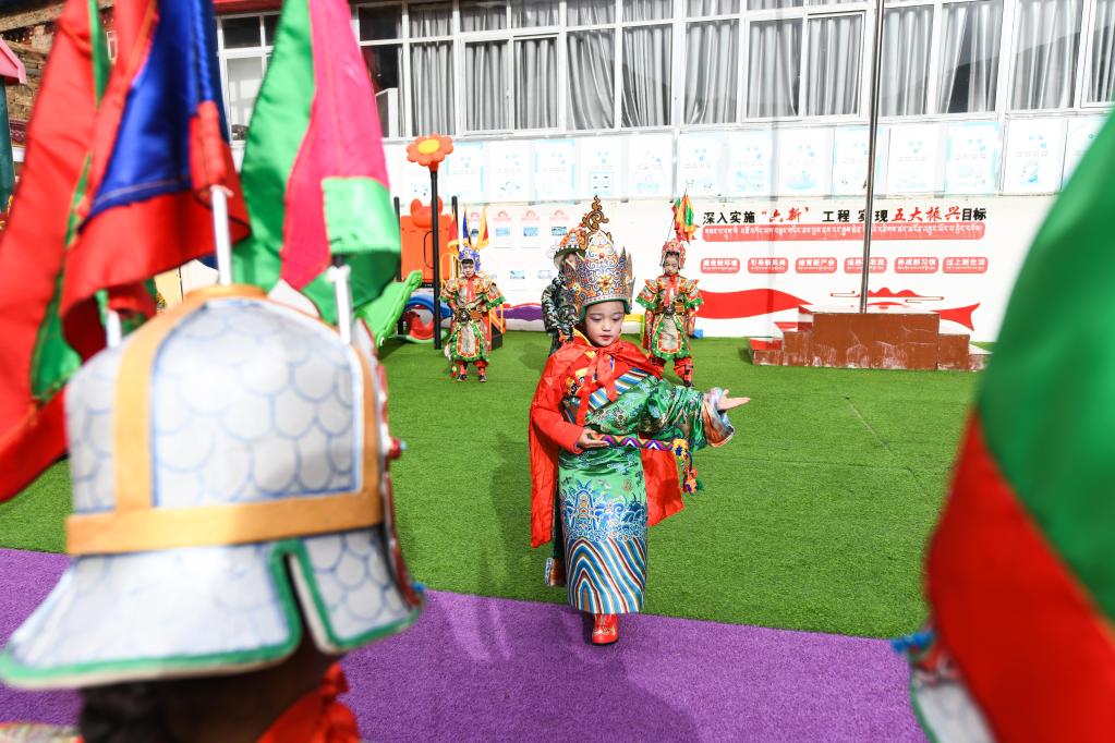 在四川省阿壩藏族羌族自治州壤塘縣茸木達鄉巴爾依村幼兒園,學生們正在表演藏戲(2022年10月16日攝)。新華社記者王曦 攝
