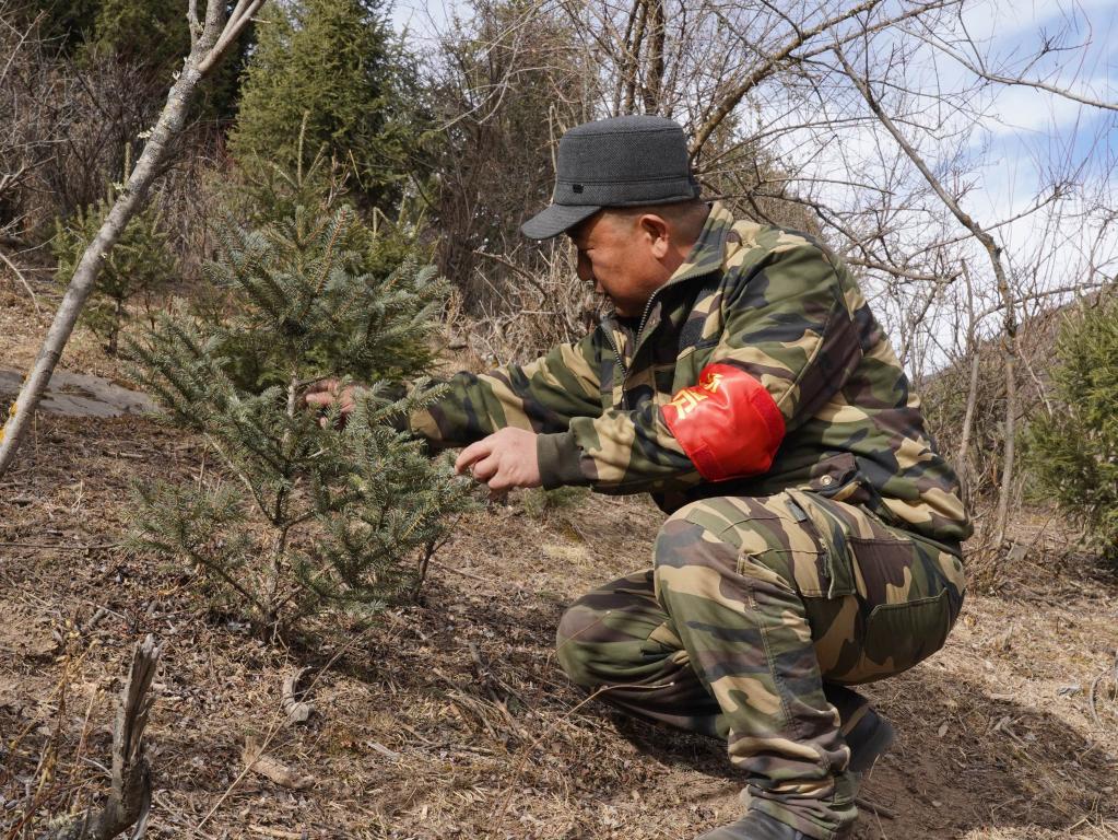 護林員楊安生正在林場查看云杉的生長情況。(新華社記者 周夢蝶 攝)
