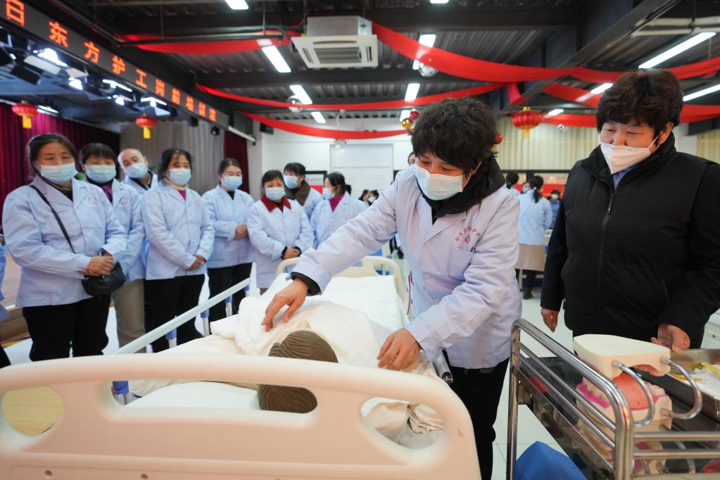 2月4日,在北京市房山區(qū)今日東方培訓基地,今年50歲的護工武翠英(前右二)在培訓課程上演示對于臥床病人的看護照料。新華社記者 鞠煥宗 攝