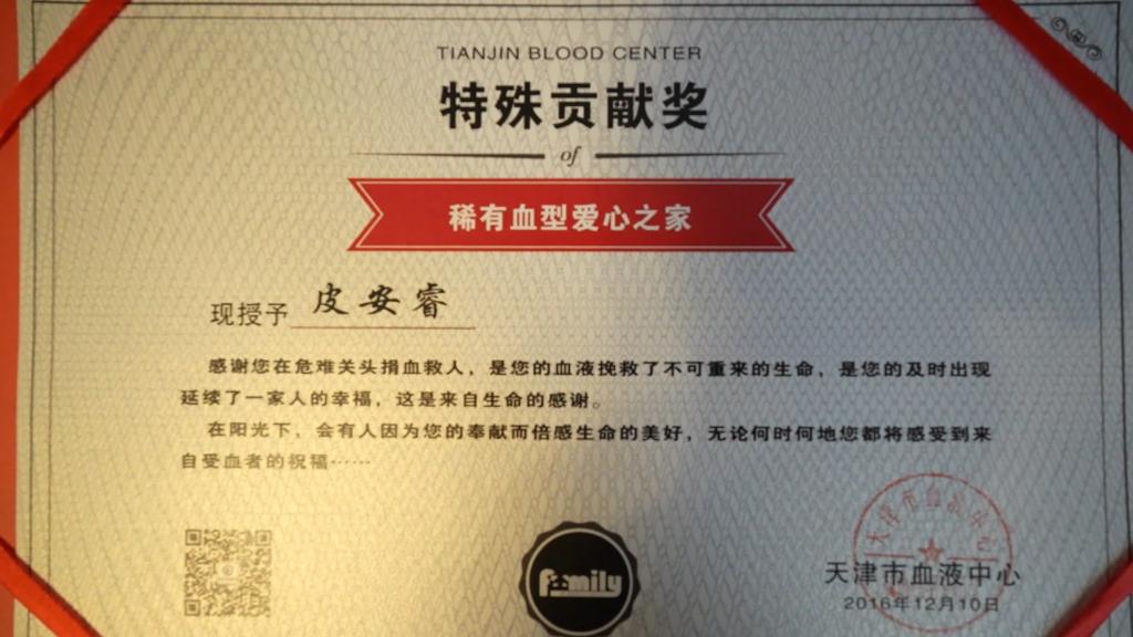 皮安睿是居住在天津的一名澳大利亞籍獻(xiàn)血志愿者。從2008年至今,皮安睿已經(jīng)堅(jiān)持獻(xiàn)血超過14年,累計(jì)獻(xiàn)血和血小板超過270次,以治療單位計(jì)算,相當(dāng)于獻(xiàn)血量超過42萬毫升,這是一個(gè)成年人自身血量的90多倍。