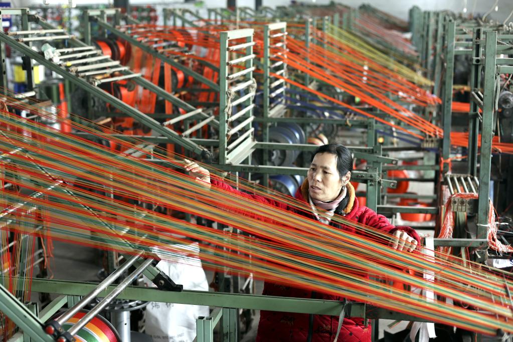 2月18日,山東省濱州市惠民縣姜樓鎮(zhèn)一家繩網(wǎng)企業(yè)工人在趕制一批來(lái)自國(guó)外的安全帶訂單。(新華社記者范長(zhǎng)國(guó) 攝)