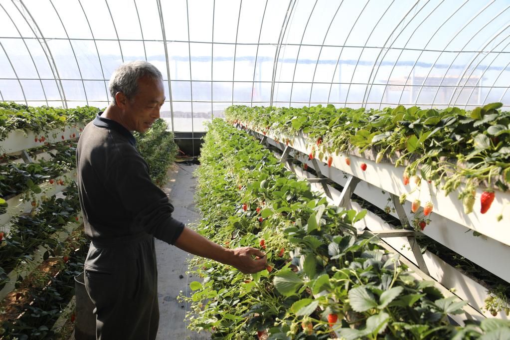 村民在大棚里查看草莓長(zhǎng)勢(shì)。(新華社記者齊雷杰 攝)