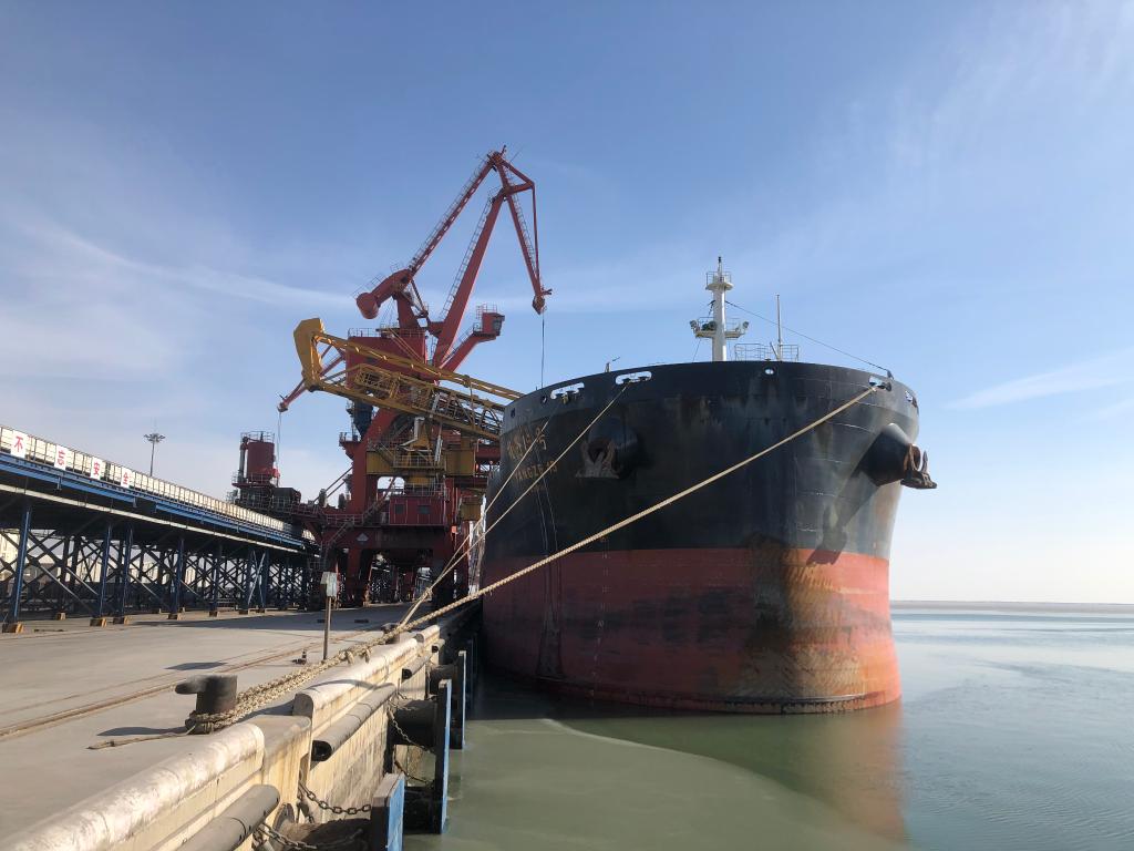 盤錦港中儲糧碼頭,一艘滿載大豆的外貿貨輪停靠在泊位上。(新華社記者鄒明仲攝)