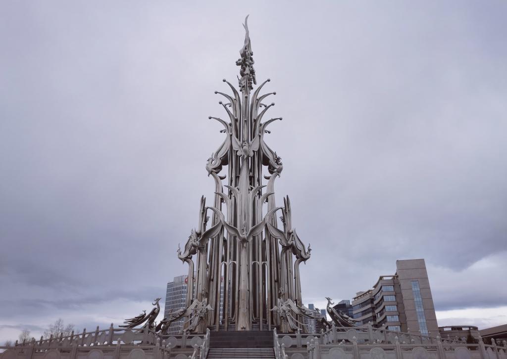 行走在克拉瑪依,“油”的標識隨處可見。在市政府南廣場,一座高58米、名為“克拉瑪依之歌”的城市雕塑引人注目。三層鳳凰環繞貫穿上下的立柱展翅欲飛,象征著老中青三代石油人艱苦奮斗的崢嶸歲月。