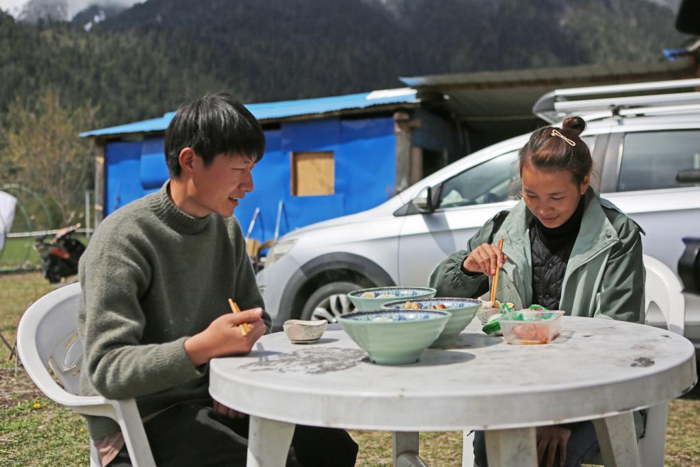 3月24日,白瑪?shù)录驼煞蛞蠛显诿袼揲T前吃飯。 新華社記者 格桑朗杰 攝