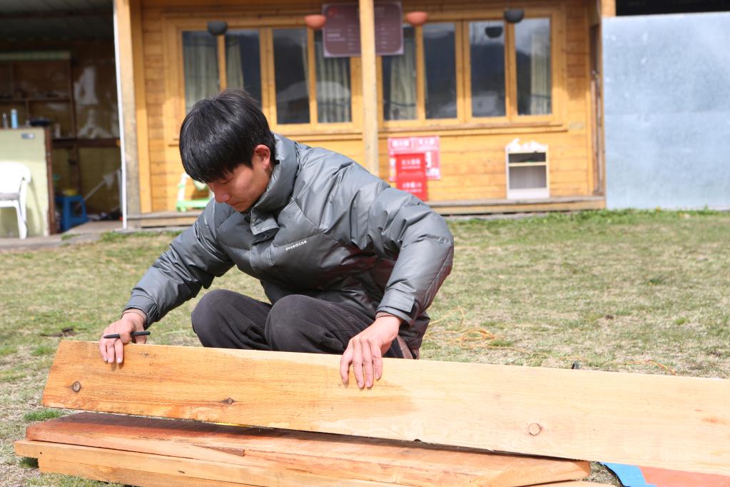殷合將工具擺在草坪上,開始制作民宿的木桌木椅