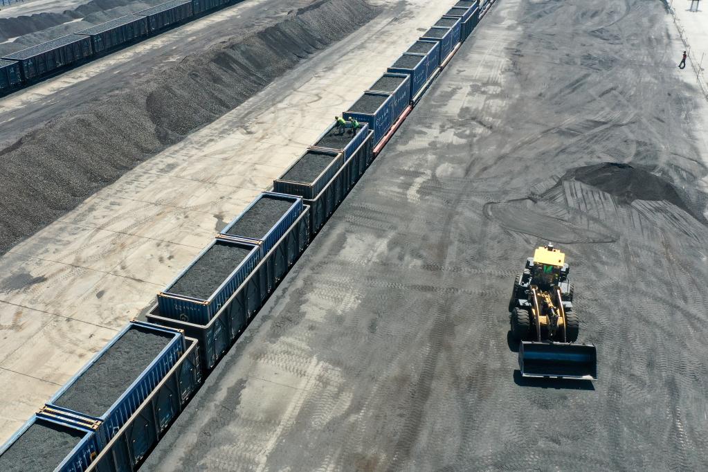 在位于哈密市伊吾縣的淖毛湖站,工作人員正將煤炭裝入火車(2022年7月26日攝)。新華社記者 丁磊 攝