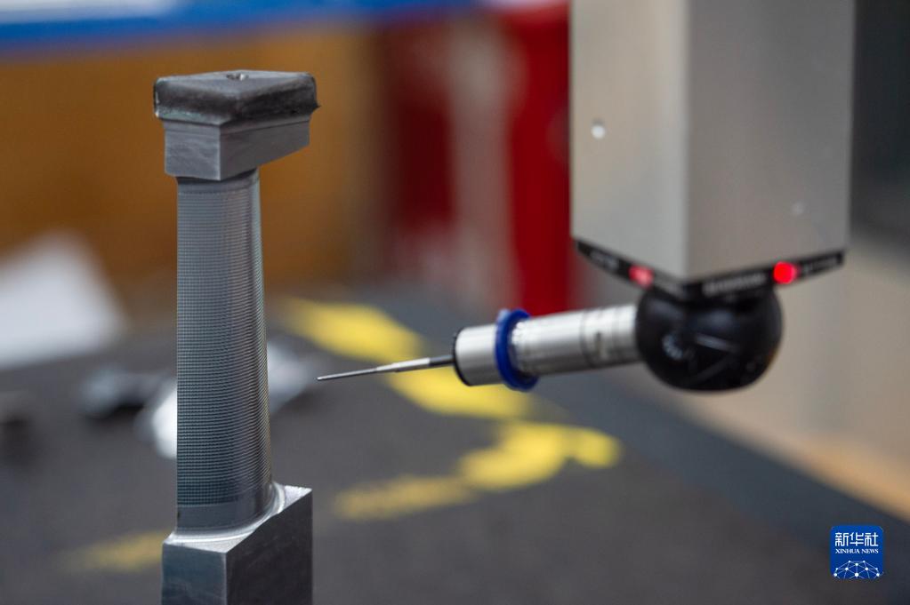 在哈電集團哈爾濱汽輪機廠有限責任公司葉片分廠數字化(智能)車間,三坐標測量機在測量工件的有關數據(3月29日攝)。新華社記者 謝劍飛 攝