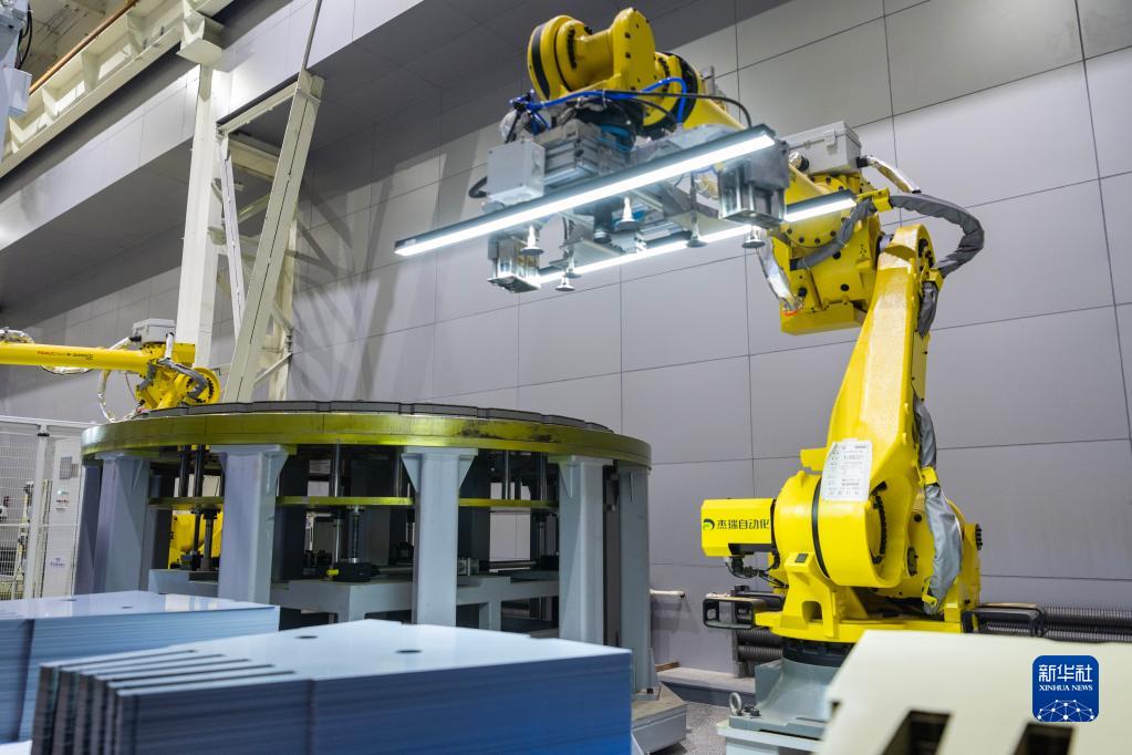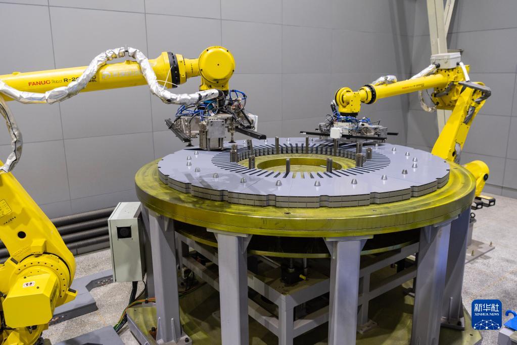在哈電集團哈爾濱電機廠有限責任公司的生產車間,智能疊片機器人在進行自動化作業(3月29日攝)。新華社記者 謝劍飛 攝