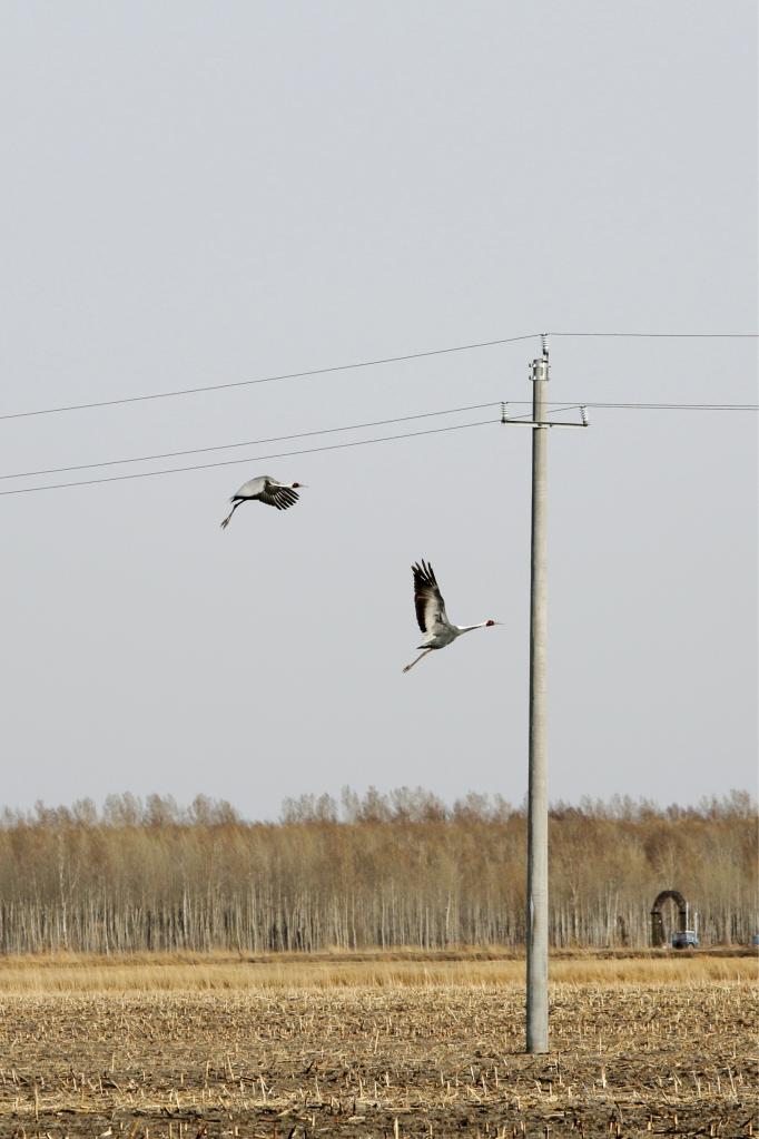 4月24日,在黑龍江省大慶市林甸縣鶴鳴湖鎮建國村,野生白枕鶴在田間飛翔。新華社記者石楓 攝