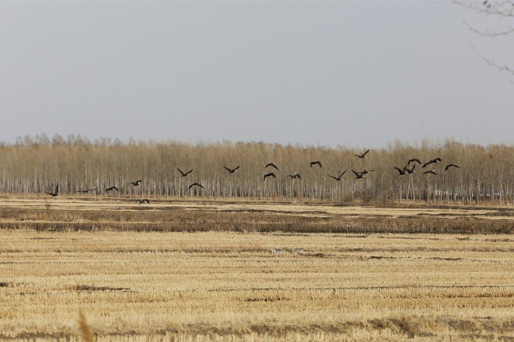 車行農田間,經過一大片草甸。忽然,吳志林說:“前邊有一群白頭鶴在飛?!庇浾哌h遠望去,呈“人”字形飛翔的鶴群,漸漸落在遠處的農田里。