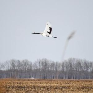 4月25日,在黑龍江省大慶市林甸縣鶴鳴湖鎮建國村,野生丹頂鶴在田間飛翔。新華社記者石楓 攝