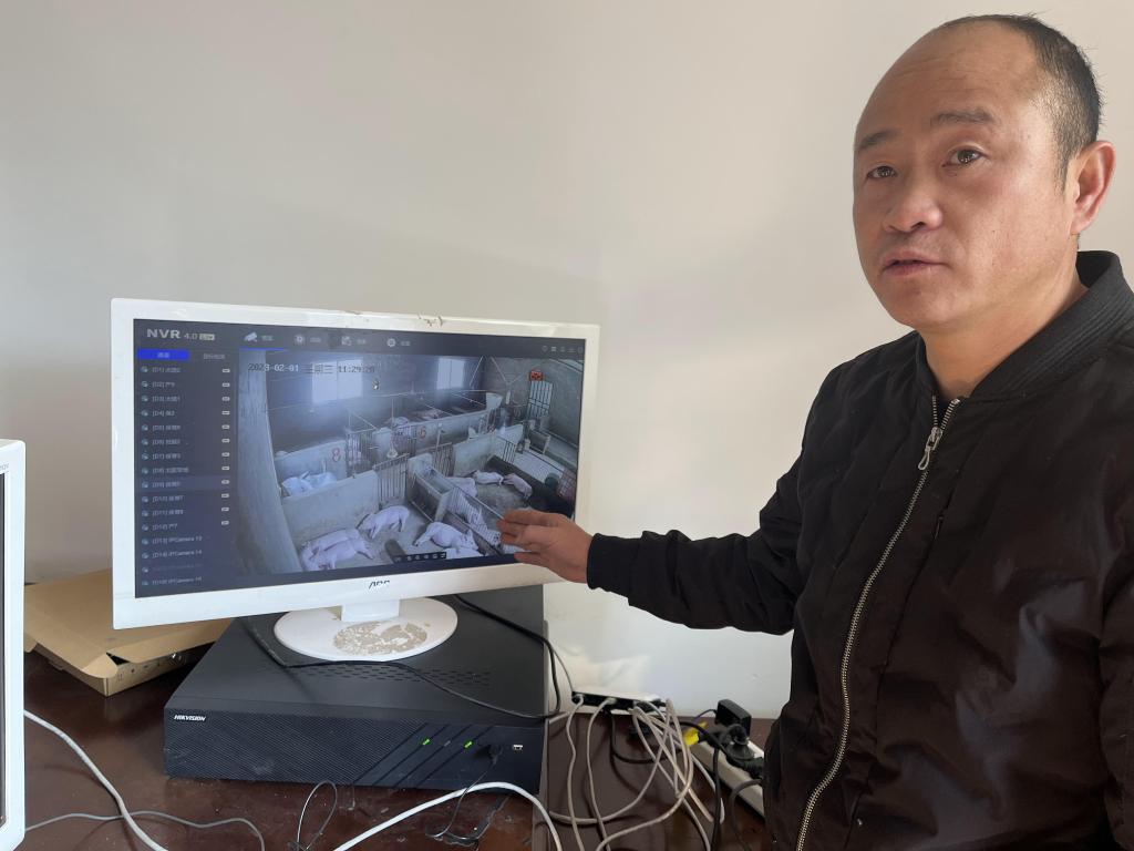 圖為2023年2月1日拍攝的何西康通過線上視頻監控平臺查看豬崽生長情況。新華社記者李驚亞 攝