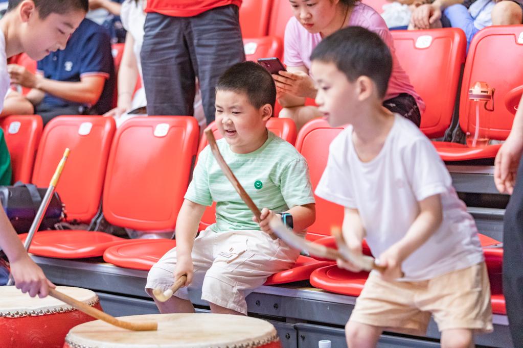 5月28日晚,小朋友在場邊為球員擊鼓加油。