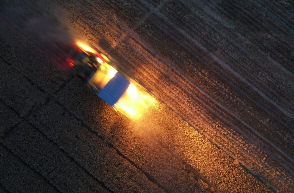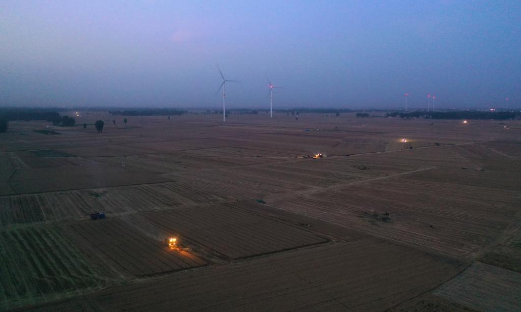 6月7日晚,收割機(jī)在袁營村搶收(無人機(jī)照片)。新華社記者張浩然 攝
