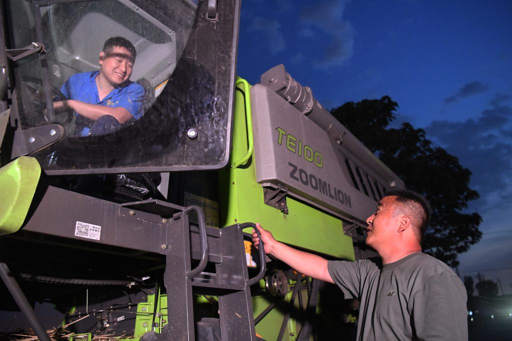 6月7日晚,村支部書記吳東星(右)和農(nóng)機(jī)手溝通收割注意事項(xiàng)。新華社記者張浩然 攝