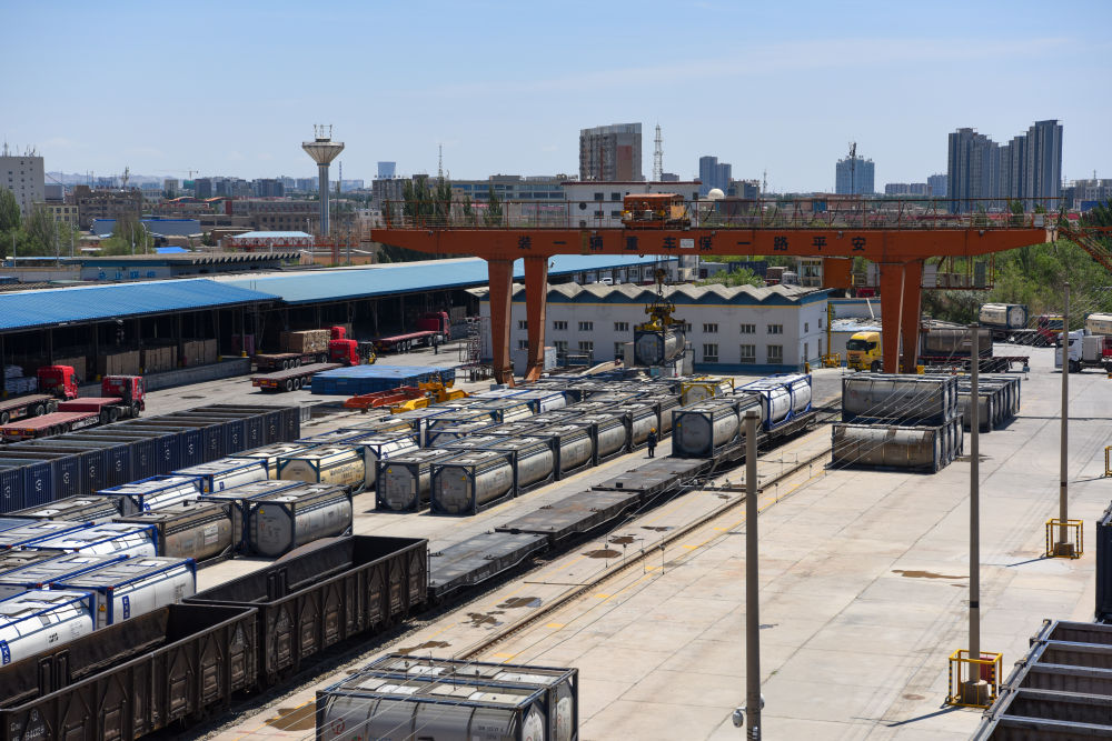 在新疆庫爾勒鐵路貨場,工作人員操作龍門吊進行裝車作業(5月30日攝)。新華社記者 丁磊 攝