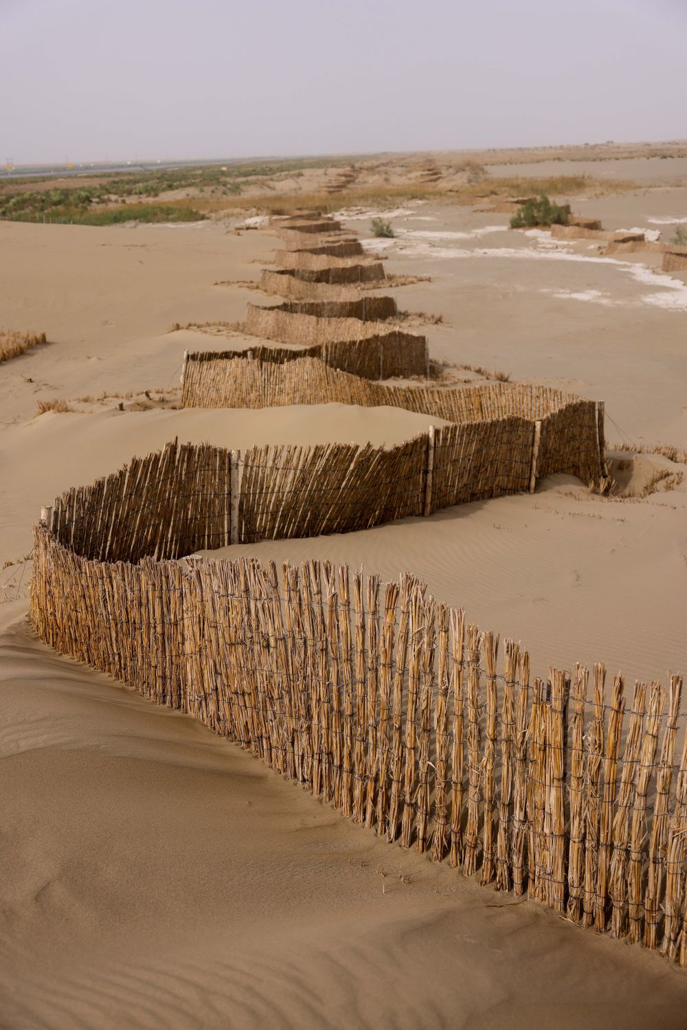 塔克拉瑪干沙漠一年中有7個月是風季,火車在沙漠行駛,風沙是主要威脅。記者從車廂向外看去,軌道兩邊,數百米寬的阻沙障、草方格和植物帶猶如綠帶,為列車“護航”。
