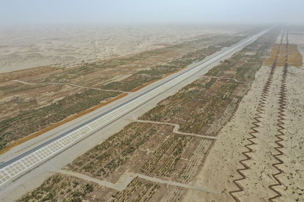 記者從中鐵第一勘察設計院集團有限公司了解到,在被流動沙丘侵害嚴重的和若鐵路沿線,建設者修建草方格近5000萬平方米,種植梭梭、紅柳、沙棘等灌木和喬木近1296萬株,林帶覆蓋面積超過11萬畝,這條“綠色走廊”成為防風固沙的天然屏障。
