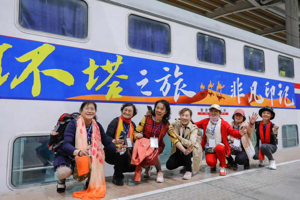 在新疆烏魯木齊站,游客在“環塔之旅·非凡印記”旅游專列前合影(3月27日攝)。新華社發(陳繼偉 攝)