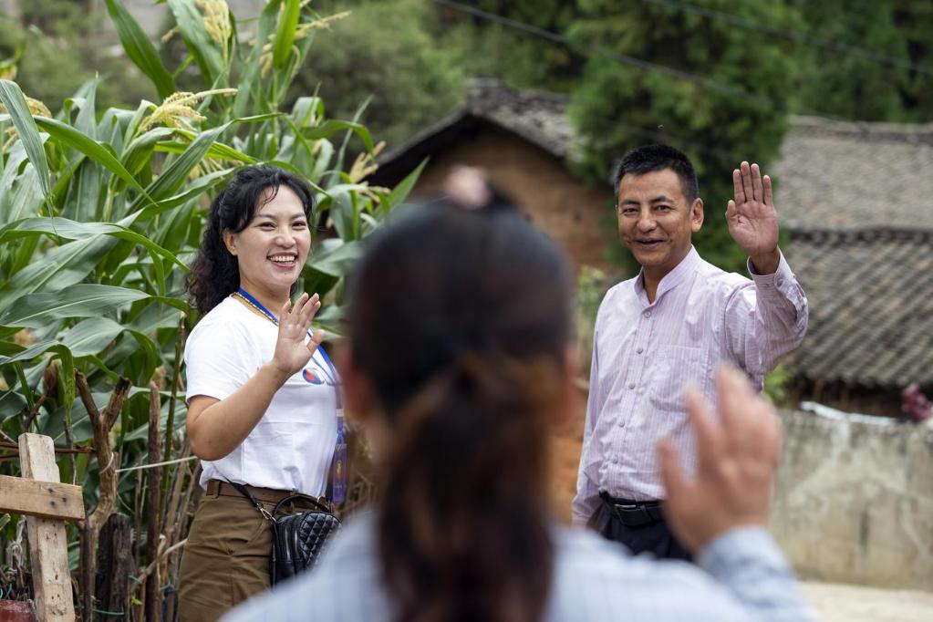 2021年6月23日,時任四川省涼山彝族自治州喜德縣光明鎮禁毒防艾專職副書記魯剛(右)和社區戒毒(康復)工作站專職社工阿加五呷(左)在看望一名社區戒毒康復人員后與她揮手道別。 新華社記者 沈伯韓 攝