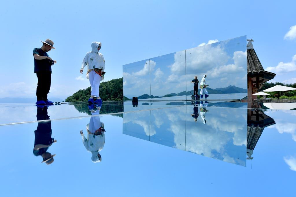 6月25日,游客在宣恩縣鑼圈巖村一處鄉村民宿的“天空之鏡”景點游玩。新華社發(宋文攝)