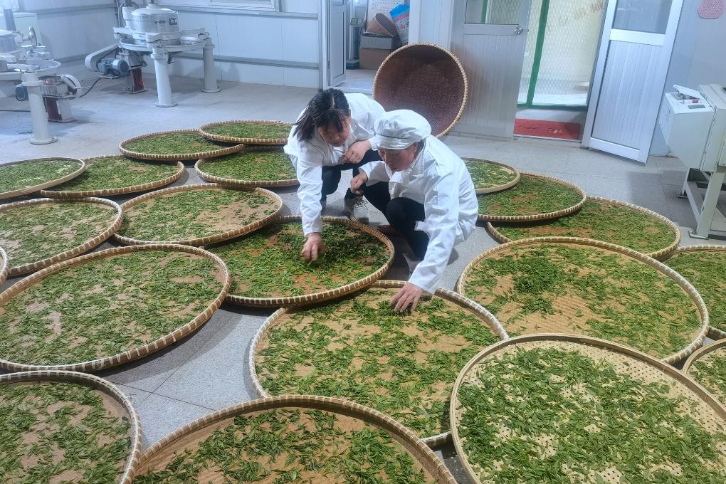山東省農(nóng)科院茶葉專家田麗麗(左)在合作基地查看紅茶茶葉萎凋程度。(受訪單位供圖)