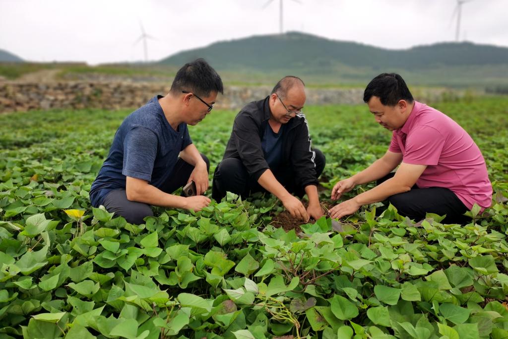 山東省農(nóng)科院甘薯專家解備濤(中)在調(diào)查甘薯生長(zhǎng)情況。(受訪單位供圖)